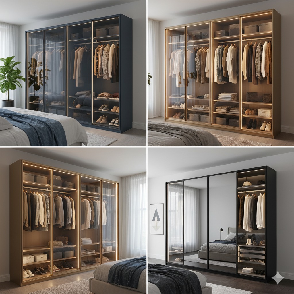 - Vitrin Etkisi: Camın yarı şeffaf yapısı, dolap içindeki düzenli eşyaların (örneğin, özel ayakkabılar, çantalar) silüet halinde görünmesini sağlayarak dolabı bir vitrin estetiğine taşır.