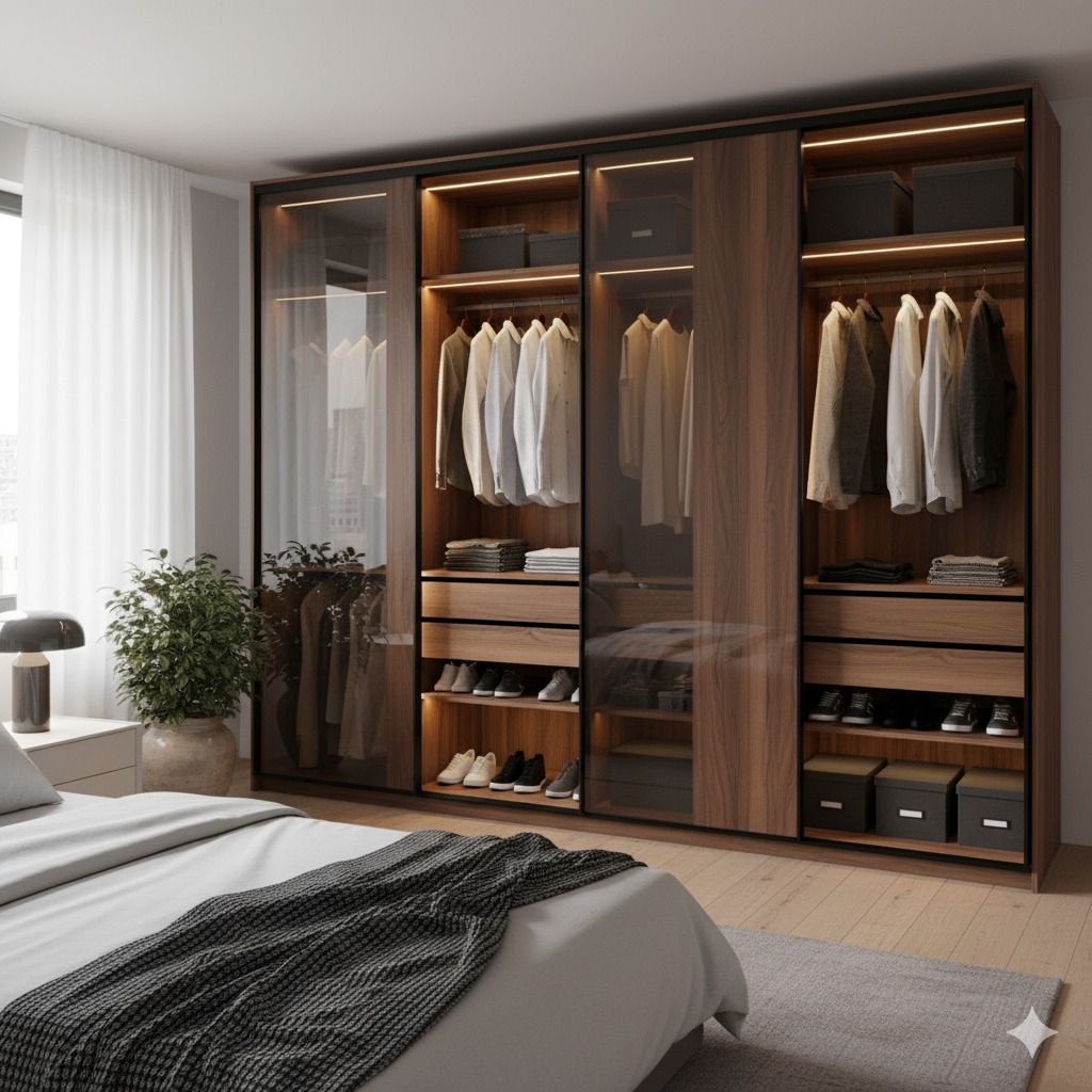 - Reflekte Cam: Bronz reflekte camlı ray dolap veya füme reflekte camlı ray dolap gibi seçenekler, camın maliyeti ve temperleme işlemi nedeniyle en yüksek fiyatlı kapak türlerindendir.